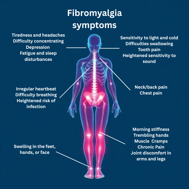 Fibromyalgia is a complex, chronic condition that causes widespread pain, fatigue, sleep disturbances, and cognitive difficulties.