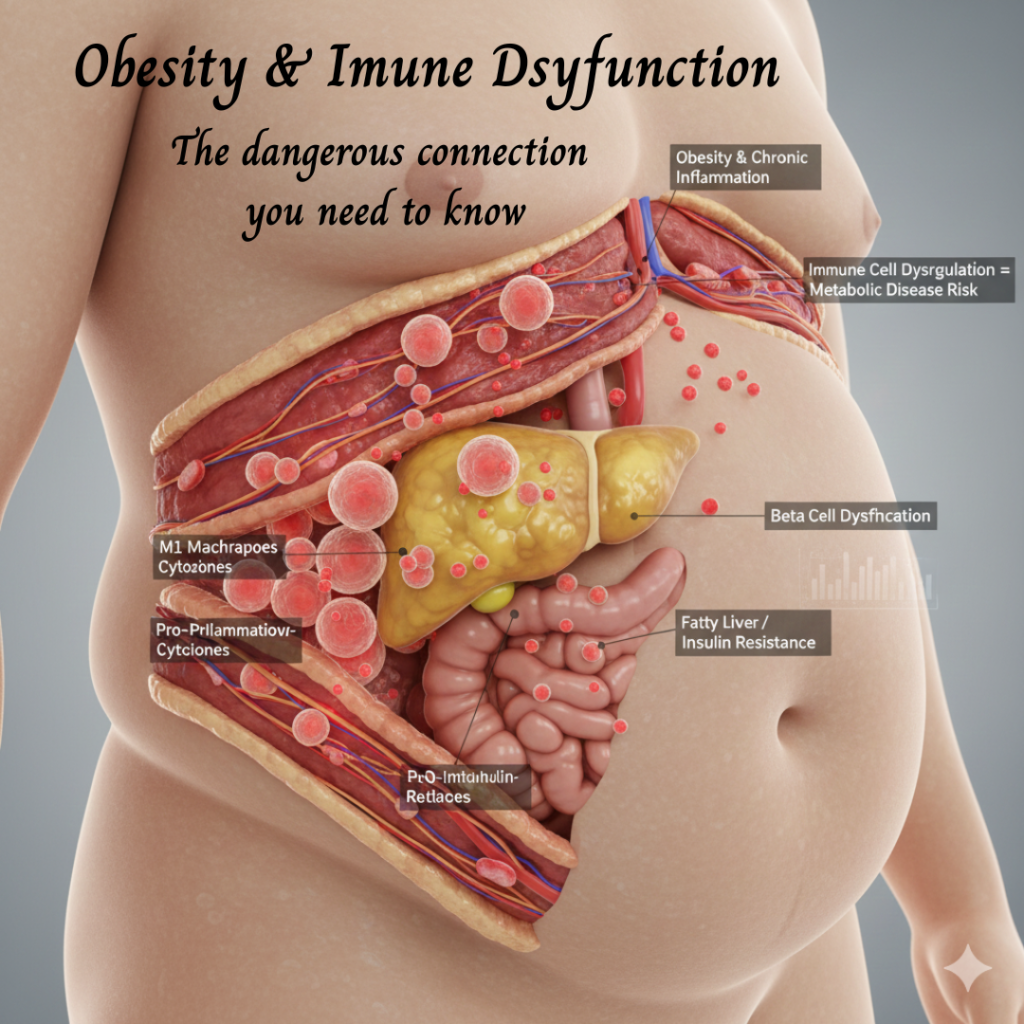 Obesity isn’t just carrying extra weight — it changes the way your immune system works. In fact, fat tissue (especially belly fat) behaves like an active endocrine organ, producing hormones and immune-modulating chemicals that impact the entire body.